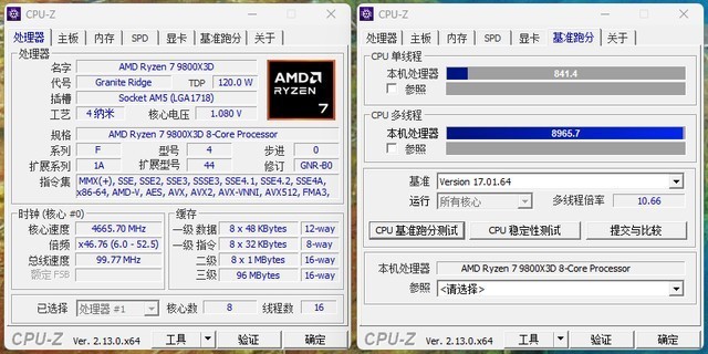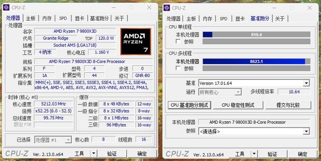 我们先采用处理器默认+内存EXPO模式进行一轮测试。CPU-Z测试,9800X3D单核810.4,全核8623.1。