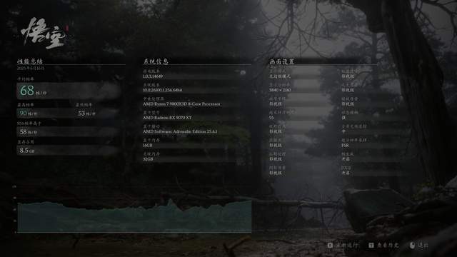 《黑神话:悟空》采用同样的设置——4K影视级,光追中,FSR55,平均帧数从60提升至68,最低帧数从40提升至53,基本把小卡顿给消除了,玩起来更加流畅,CPU超频的效果还是挺明显的。