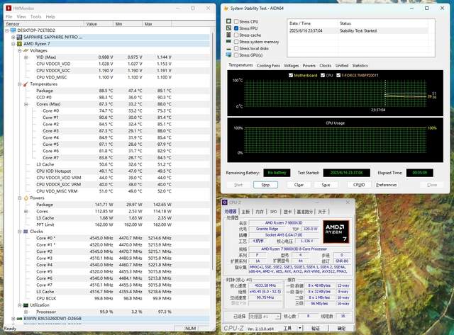 FPU烤鸡五分钟,9800X3D电压为1.136V,功耗141.7W,温度88.5℃。