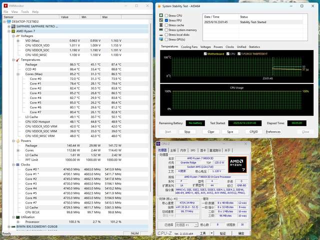 手动PBO设置之后FPU烤鸡五分钟,9800X3D电压为1.120V,功耗140W,温度86.5℃。