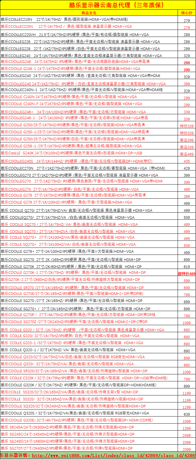 一、酷乐显示器:全场景覆盖,品质与性价比兼具酷乐(CCOLLE)作为专注显示领域的品牌,产品线覆盖商务办公、家用娱乐、电竞游戏等多元场景,以 “实用、可靠、亲民” 为核心,精准匹配云南本地市场需求。 1. 商务办公系列:高效护眼,稳定耐用 针对企业办公、政企采购、网吧网咖等场景,酷乐推出 21.5 英寸 C220N、23.8 英寸 G240、32 英寸 G320 等经典型号,均采用 IPS 广视角面板,1920×1080 全高清分辨率,178° 可视角度,多人协作无偏色。核心优势在于低蓝光、不闪屏技术,长时间办公不易疲劳;搭配微窄边框、金属 V 型支架,支持 VESA 壁挂,适配多屏拼接与桌面灵活布局,HDMI+VGA 双接口兼容新旧设备,3 年全国联保,满足企业长期稳定使用需求。