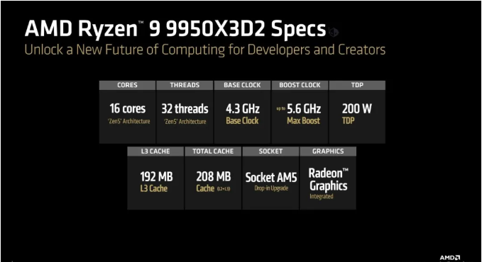 AMD 锐龙 9 9950X3D2处理器:208MB 缓存王者降临! 当处理器性能的军备竞赛进入白热化阶段,AMD 再次以技术创新打破天花板。2026 年 3 月,全球首款双 CCD 3D V-Cache 消费级处理器 —— 锐龙 9 9950X3D2 正式登场,以208MB的恐怖总缓存容量,重新定义高端桌面平台的性能极限。这款定位终极旗舰的新品,不仅是游戏玩家的梦想座驾,更是专业创作者的效率利器,凭借颠覆性的缓存架构与 Zen 5 强劲核心,成为当前 AM5 平台的性能新巅峰。