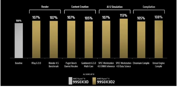 二、技术亮点:全核心高速访问,终结调度难题 此前 X3D 系列处理器因单 CCD 缓存设计,存在核心与缓存访问不均衡的问题,部分核心需跨 CCD 调用数据,产生延迟损耗。而 9950X3D2 的双缓存设计,从根源解决这一行业痛点: 全核心低延迟:16 颗核心均可直接、低延迟访问超大缓存,无论游戏、渲染还是多任务,性能调度更均衡、更高效。 第二代 3D V-Cache 优化:缓存堆叠位置调整至核心下方,提升散热效率 46%,即便 TDP 达 200W,仍能稳定维持高频输出。 内存与超频潜力:完美支持 DDR5 6400 + 高频内存,官方实测可稳定运行 DDR5-8800 CL32,缓存与高带宽内存协同,进一步释放性能潜力。 三、性能实测:游戏与生产力,全能无短板 作为 “双旗舰” 定位产品,9950X3D2 在两大核心场景均实现显著突破,相比 9950X3D 综合性能提升5%~13%: 1. 游戏性能:4K 高帧丝滑,复杂场景稳如磐石 超大缓存是游戏帧率的 “稳定器”,尤其在 3A 大作、开放世界及处理器依赖型游戏中优势突出: 帧率与稳定性:4K/2K 高画质下,平均帧率提升 5%~8%,1% 低帧提升超 10%,《赛博朋克 2077》《黑神话:悟空》等大作复杂场景无卡顿、不掉帧。 场景适配:《都市天际线 2》《我的世界》等超大地图、海量实体场景,加载速度更快、运行更流畅,彻底告别因缓存不足导致的卡顿与闪退。 对比竞品:相较 Intel Ultra 7 270K Plus,游戏性能领先 8%~12%,高负载下帧率稳定性优势更明显。