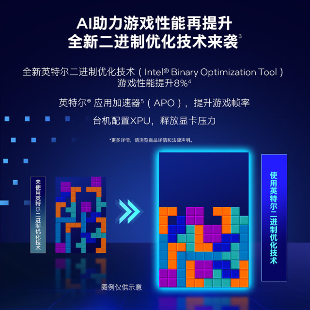 三、技术亮点:二进制优化 + 生态增强,长效性能保障 除硬件升级外,Ultra 7 270K Plus 搭载多项英特尔全新技术,构建 “硬件 + 软件” 协同优势。 英特尔二进制优化技术:四十年负载优化成果,自动提升 IPC 与程序兼容性,对旧软件、跨平台游戏自动适配,长期使用性能不衰减英特尔。 内存超频保修:支持 DDR5 8000MT/s + 超频并保留官方保修,搭配 Z890/B860 主板可充分释放内存潜力,降低游戏与设计延迟英特尔。 AI 生态整合:NPU 支持 Windows Studio 特效、AI 降噪、智能画面增强,直播、剪辑、办公场景 AI 辅助更流畅Intel。