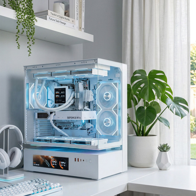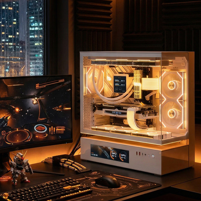 三、外观与体验:纯白电竞风,颜值拉满 1. 外观颜值 这套主机最大的亮点就是“全白主题”,从机箱、水冷、内存、显卡到电源、外设,所有硬件均采用白色设计,搭配RGB灯光,视觉效果出众。骨伽CFV235机箱的玻璃侧透设计,可清晰看到内部整齐的硬件布局,白色的主板、内存、显卡相互映衬,6个骨伽星链V2积木风扇的灯光可与内存、显卡灯光同步,营造出极具氛围感的电竞视觉效果。机箱正面的自定义屏幕,可实时显示CPU、显卡温度、帧率等参数,既实用又具科技感,整体颜值符合当下年轻玩家的审美需求。