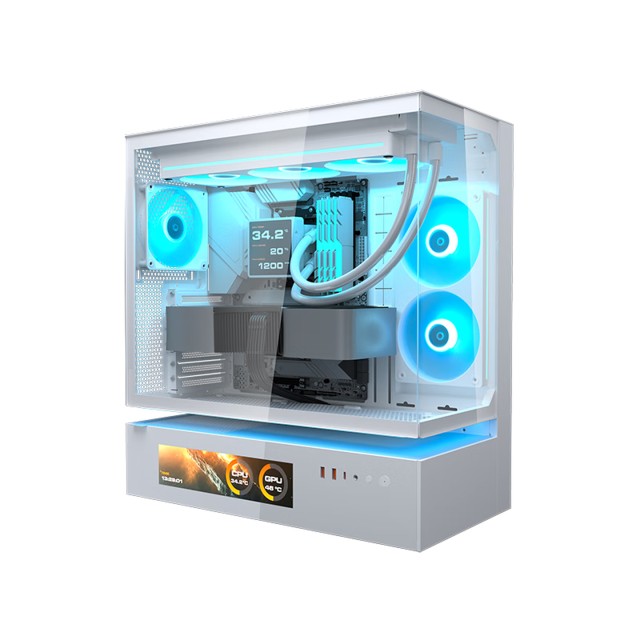 机箱选用骨伽CFV235 凌空VISION 白色屏幕版玻璃侧透机箱,白色机身搭配玻璃侧透设计,可清晰看到内部硬件和灯光效果,机箱正面配备可自定义显示的屏幕,既能显示硬件参数,也能设置个性化画面,提升电竞氛围。机箱内部空间充足,支持360mm水冷安装,兼容各种大型硬件,同时预留充足的理线空间,便于整理线缆,让机箱内部更整洁。