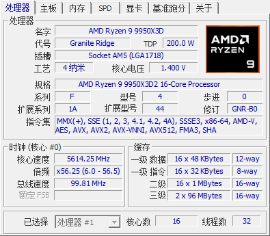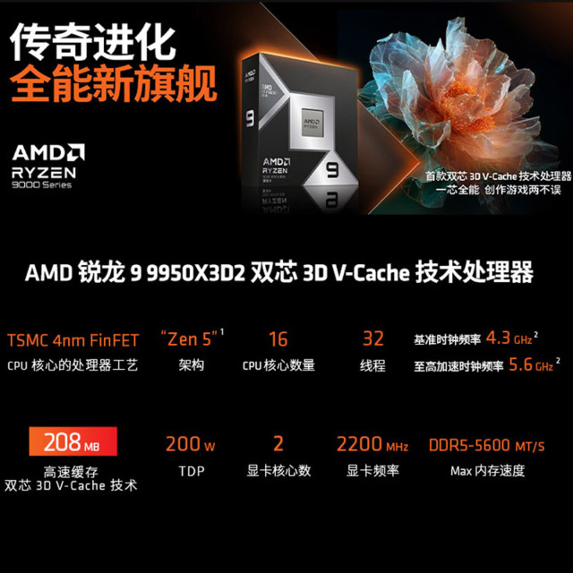 核心线程:16 核 32 线程(全大核、无小核、双 CCD) 基础频率:4.3GHz 最大加速频率:5.6GHz 缓存规格:L3 缓存 192MB(双 CCD 各 96MB 3D 堆叠缓存)+ L2 缓存 16MB,总缓存 208MB 默认 TDP:200W 指令集:完整支持 AVX512、AVX-VNNI、AES-NI、SHA、AMD Infinity Fabric 超频属性:频率锁定、不支持手动超频,仅开放电压微调、防掉压优化 平台适配:原生兼容 X870/X870E、X670E 全系列高端 AM5 主板 与前代核心差异 前代锐龙 9 9950X3D 仅单 CCD 搭载 3D 缓存,另一 CCD 为普通大容量缓存;9950X3D2 实现双芯全 3D 缓存覆盖,解决跨 CCD 数据延迟问题,多核调度效率、缓存命中率全面升级,是真正意义上 “全核游戏 + 全核生产力” 全能旗舰。